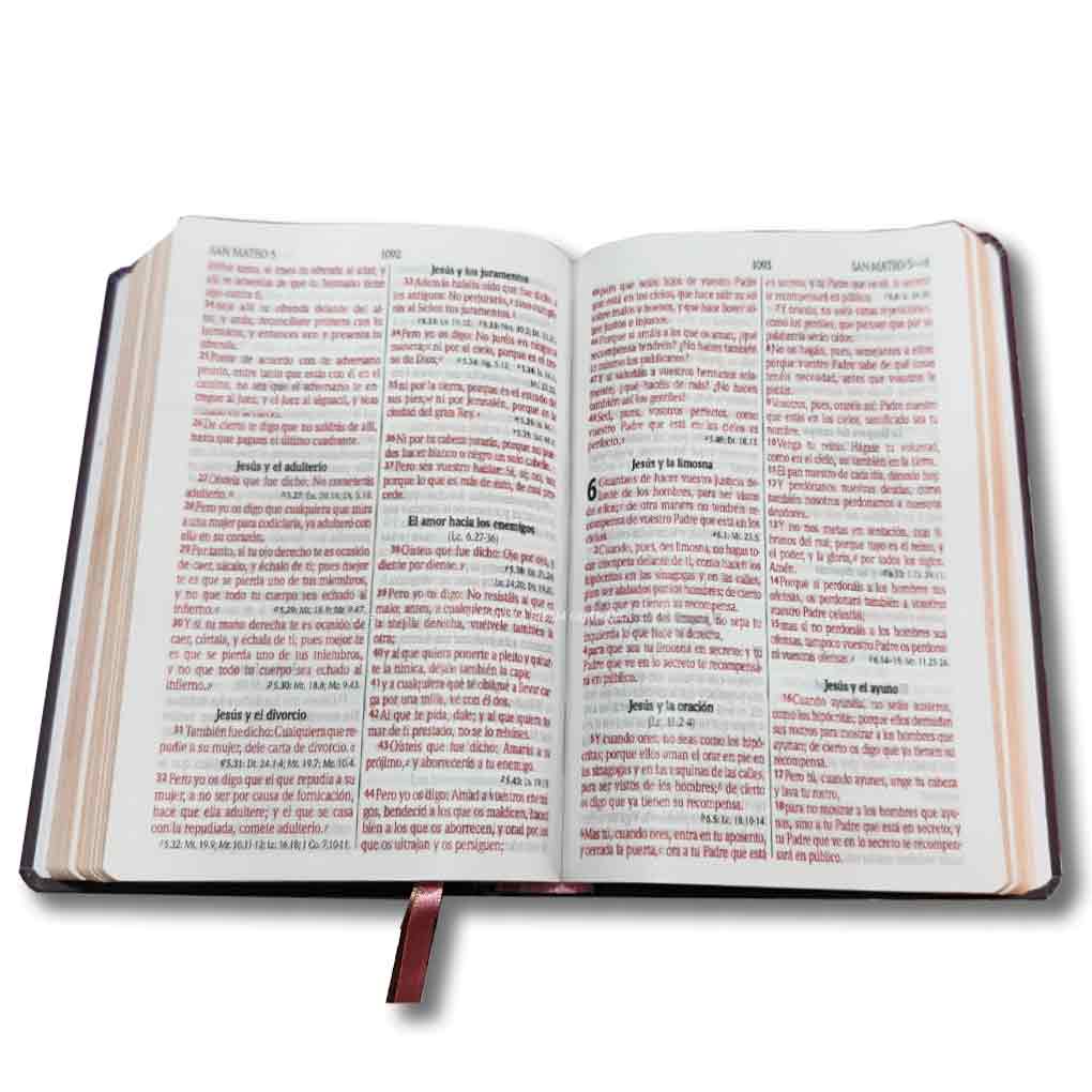 Biblia en formato elegante de alta calidad en letra grande 12 pts con encuadernación cosida y tapa dura. Útil para compartir con personas con dificultad visual pues su letra grande es de mucha ayuda.